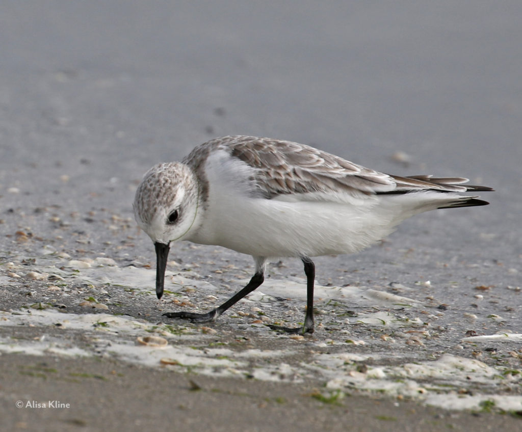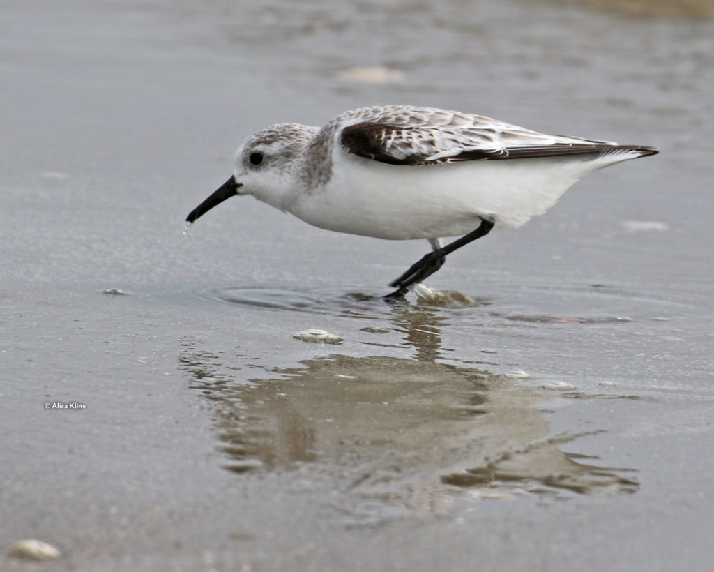 Sanderlings are the small white birds that are always two steps ahead of you when you walk on the beach. They hunt in the wet zone — where the last bit of a wave laps an inch or so of water onto the sand before slipping back into the Gulf.