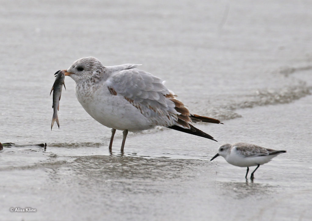 The fourth bird you will always see are seagulls. Very good birders can tell one gull from another. I am not a very good birder. But I do have bunches of photographs of seagulls eating. Such as this one. Notice the sanderling looking on, almost as though she is trying to figure out how that eating thing is done. Why do I have no photos of sanderlings eating?