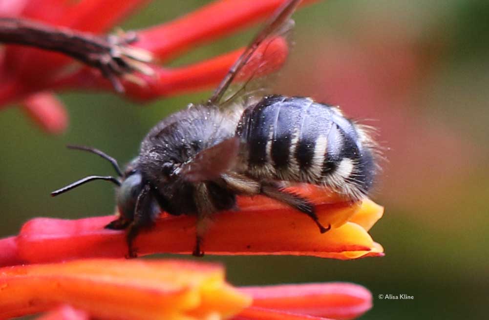 You can see the dusting of pollen along the bee’s back and the pistil, topped by its stigma, draping almost touching the bee. She will bump into it as she exits if she hasn’t already.