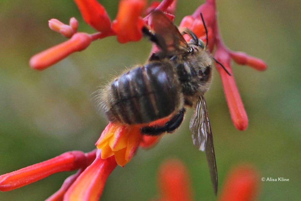 This carpenter bee has chewed a hole in the flower of this hamelia patens and has stuck in her whole mouth, up to her eyeballs. Nectar robbing par excellence!