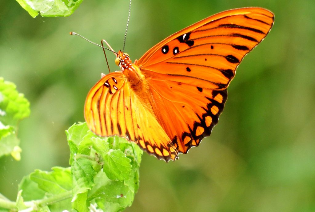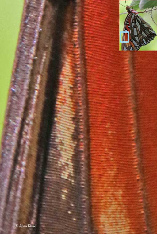 There are two mechanisms through which butterfly scales produce intense colors. The first is pigment. This is just like paint. The scale simply is a certain color. The more interesting is the second mechanism. Refraction. Scales that gain color from refraction actually bend light like a prism. Each refractive scale has air trapped inside and a variety of surfaces that can bend light. Refractive scales can be layered upon pigmented scales and the result is, well, a butterfly! On the gulf frit, the most likely scales to use refractive properties are the silvery spots on the underwing. None of these photos capture the metallic shine of those spots, but you can’t miss them if you see a gulf frit in the wild.