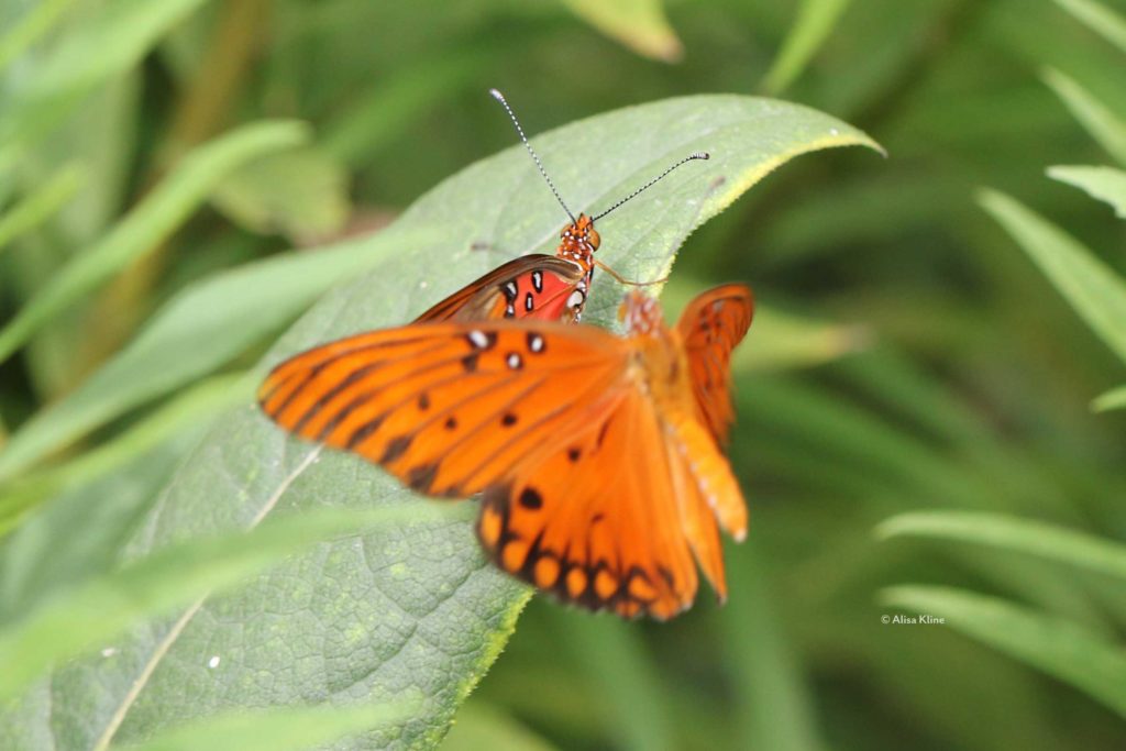 I think that is our brand-new female on the leaf. Gulf frits will live only a week or two and during that time, their colors fade and their wings get frayed. The first day or two, they really look different, especially the darker girls. The hovering butterfly is undoubtedly a male beating his wings above her to shower her with his pheromones. They are produced by specialized scales on his wings.