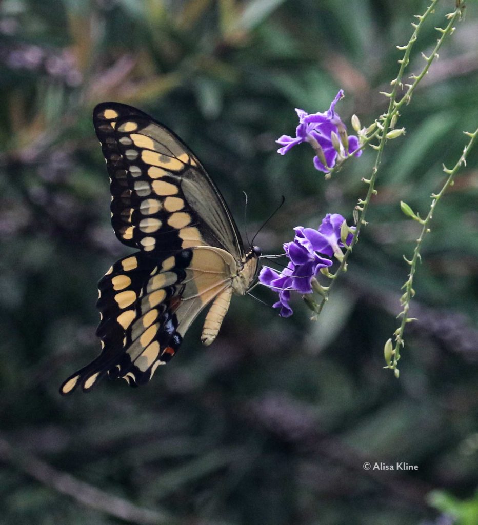 But here on the private preserve a lens specialized for things 20 feet away is of limited use. Everything that catches my eye has to be photographed close up. So I bought a lens for macro and when it gets here, perhaps I can stop writing about myself and get back to those magnificent tiny critters who still fill me with joy, like this gorgeous giant swallowtail feasting on duranta. She’s large enough to photograph from quite far away!