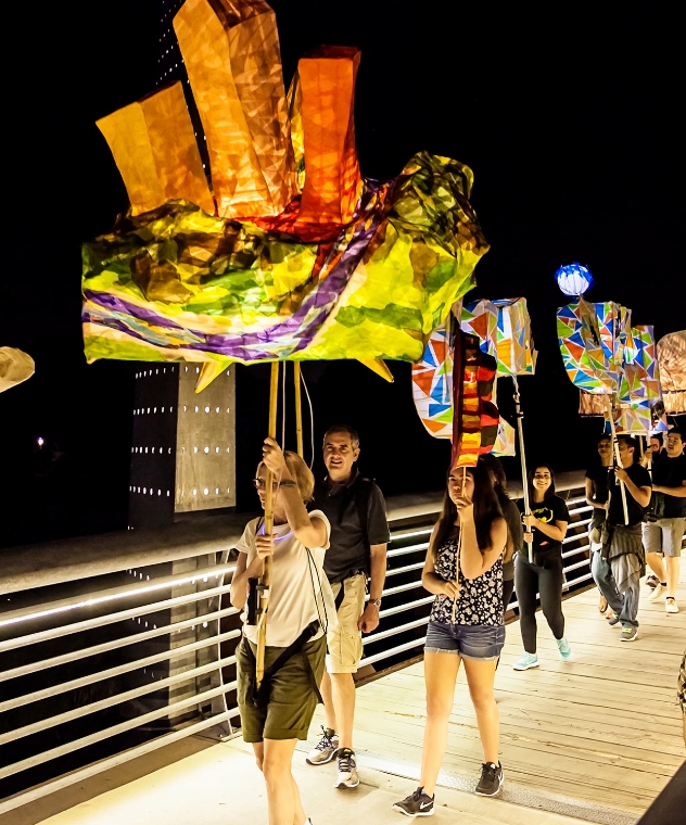 The New York-based Processional Arts Workshop helped celebrate the opening of Buffalo Bayou Park in 2015 with Confluence: A Journey in Five Movements, a magical nighttime procession. Illuminated lanterns in shapes ranging from turtles and butterflies to canoes, art cars and running shoes, snaked their way along the park’s trails while colorful Magnolia floats glided down the bayou. More than 400 volunteers from throughout Houston participated in month-long workshops to create the lanterns.