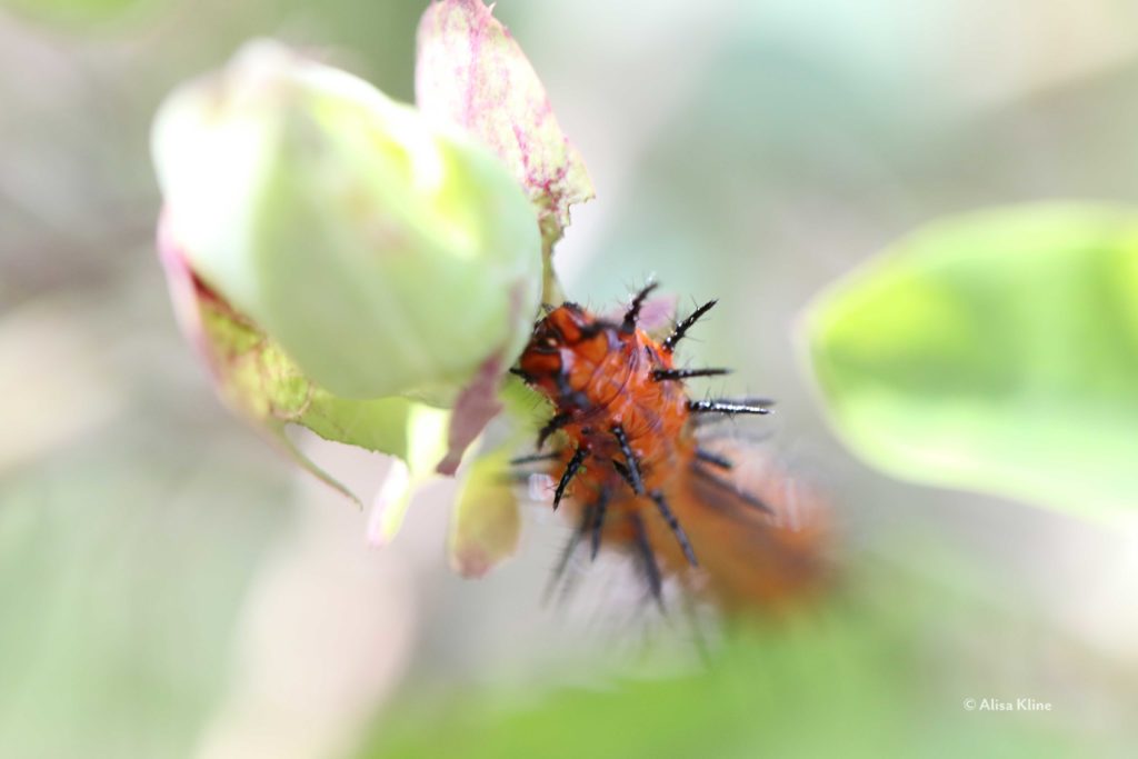 This gulf frit caterpillar has chewed through most of this passion vine leaf. Those spikes, btw, are completely harmless and softer than your toothbrush bristles.