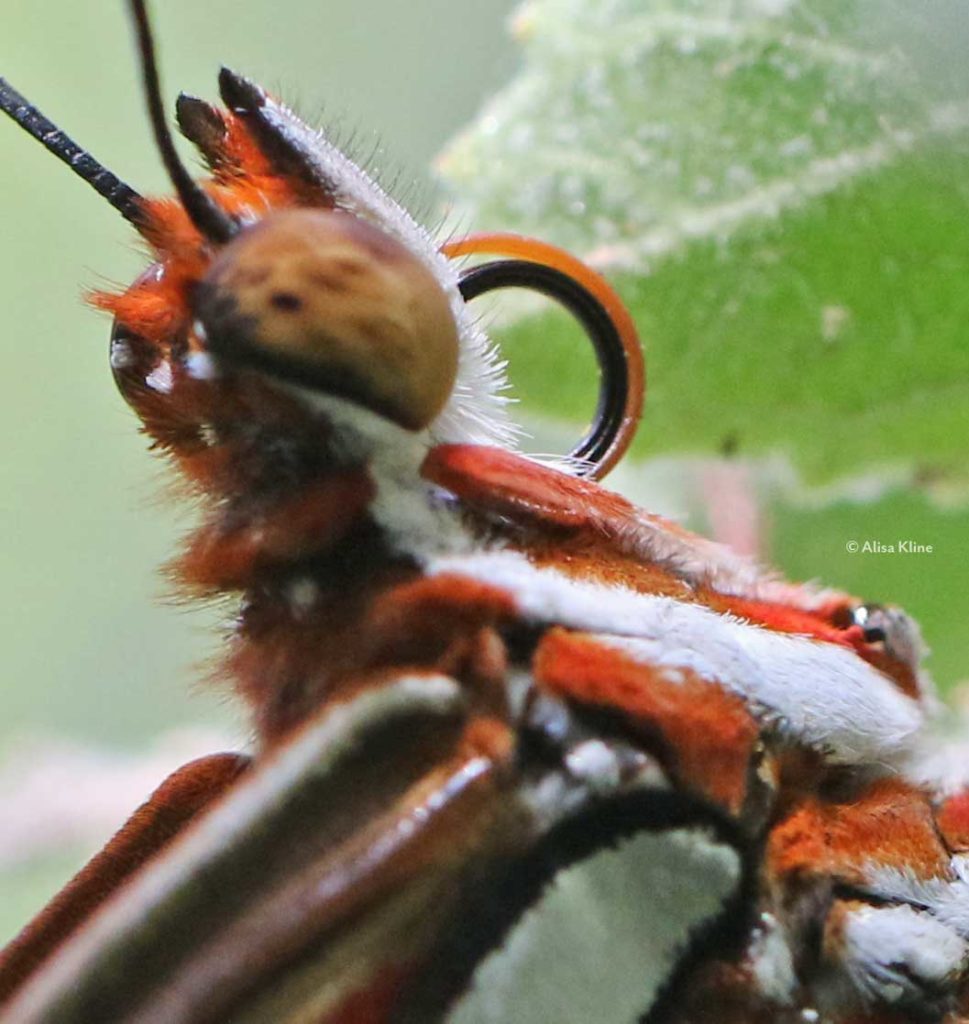 I have identified those adorable white fluffy “ears” that are standing up right above that proboscis. They are labial palps. She will use them to feel around to find food and to manipulate the environment to help her eat. They are tiny mouth pushers. An extra set of hands, since her feet are all busy hanging on. Most of the time, they aren’t kept erect like this, but this is cuter.