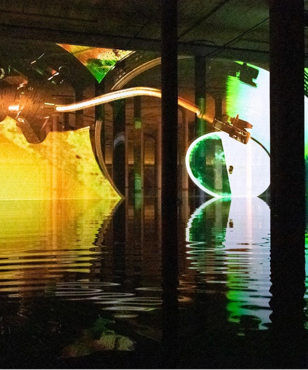 Commissioned for the Cistern by renowned multi-media artist, Anri Sala, this immersive film and sound installation transported visitors into an other-worldly environment within this vast, subterranean reservoir. The work incorporated a film projected onto a massive translucent screen depicting a weathered turntable floating in a space station. The turntable played a new original arrangement of Olivier Messiaen’s Quartet for the End of Time, originally composed in a prisoner-of-war camp in Germany during the Second World War. The arrangement, created in collaboration with André Vida and Olivier Goinard, also references another remarkable musical event: in 1986 Ronald McNair, one of the world’s first Black astronauts to reach space, had planned to play and record a saxophone solo on board the Space Shuttle Challenger.